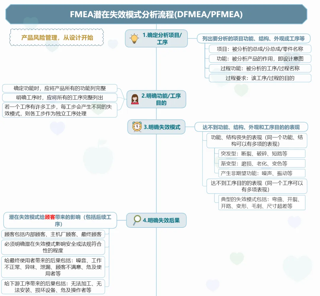 通俗解释:工厂生产前,工程师拆解生产线环节 “找茬”—— 排查机器卡壳、工艺偏差、物料出错等问题,开工前检修设备、优化工艺,确保生产顺畅、产品质量稳定不返工。