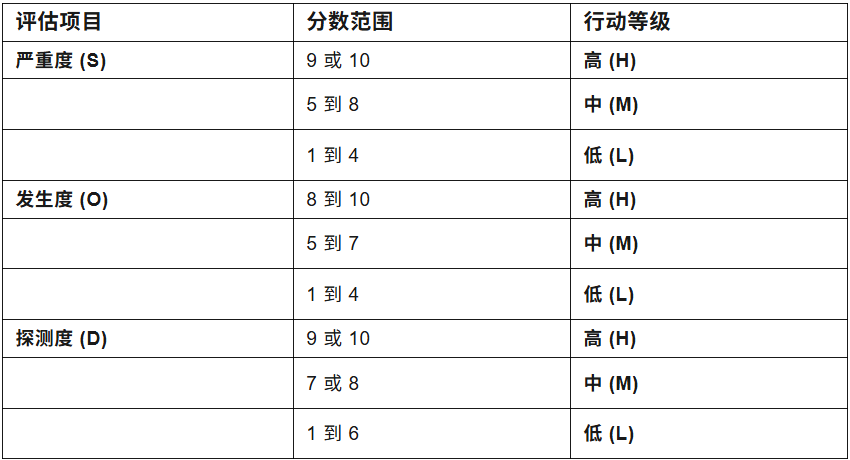 新版 FMEA 手册首先要求团队根据 S、O、D 评分表的具体标准,对失效链进行 1 到 10 的评分。然后,这些分数被转换成行动等级: