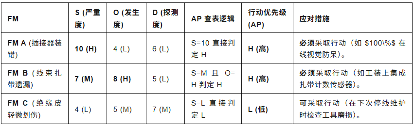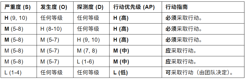 AP 机制的核心在于将严重度(S)、发生度(O)、探测度(D)的评分等级转化为高(H)、中(M)、低(L)三个级别,然后通过查表的方式直接确定所需的行动优先级
