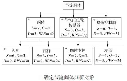 分析节流阀体的故障数据,确定S和RPN的阈值分别为5和30,分析结果见下图。由分析结果可知,需要对节气门位置传感器、怠速控制阀、阀片、阀体本体进行详细的DFMEA。