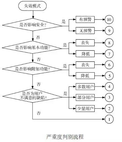 至于严重度的判定,提倡仍沿用AIAG的准则,但为了增强其可操作性,作者对其进行了进一步的归纳总结,生成如下图所示的流程;根据该流程即可很容易地判定每种故障的严重度。