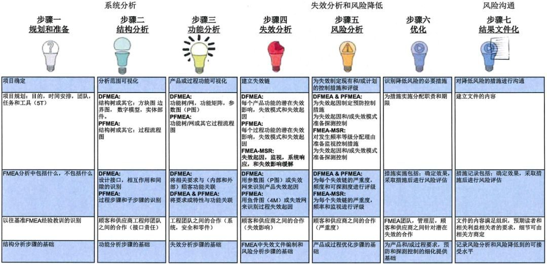 新版 FMEA的七步法,以精确、关联和完整的方式提供了技术风险记录的结构,新的结构如下: