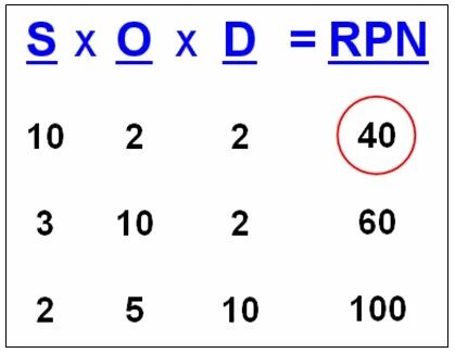FMEA严重性、发生率和检测率的得分数是主观生成的序数(1到10),RPN等于三者的乘积。